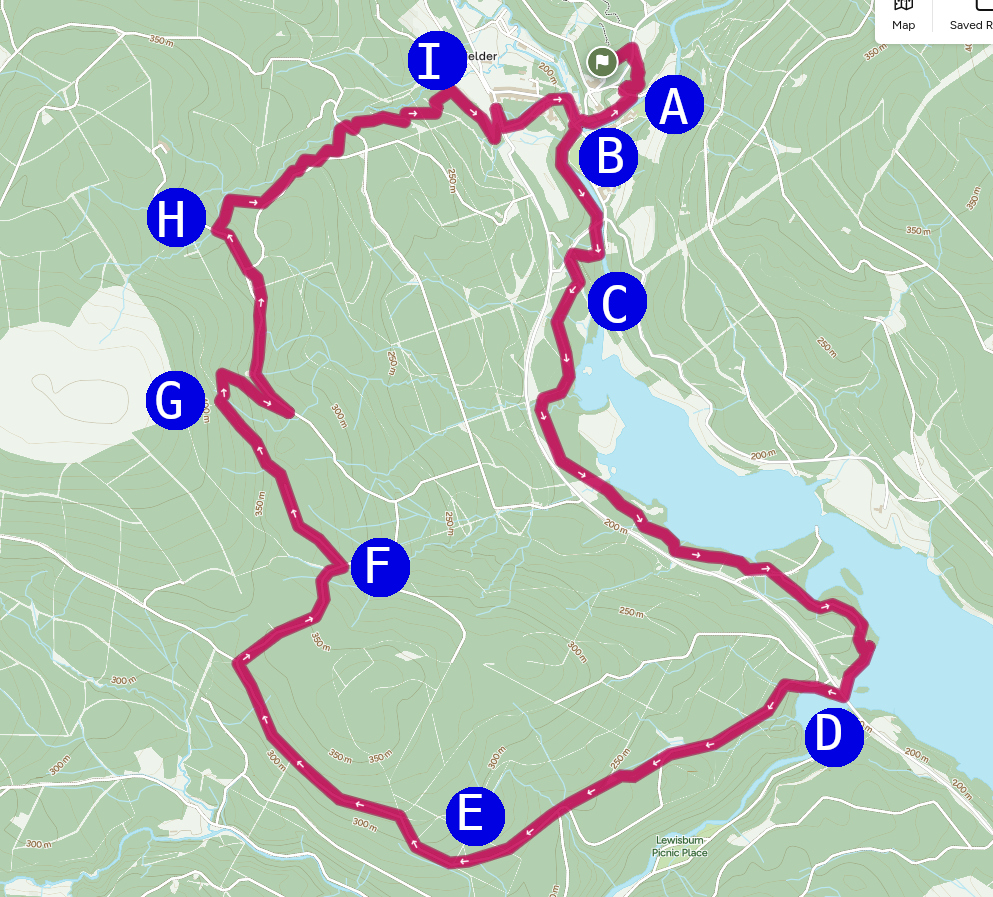 Point G is the head of the newly relaid mountain bike trail and offers a fabulous view over the reservoir on a clear day. With any luck runners might get a break in the clouds and see stars rippling of the surface should they have time to look up. The new trail was built for accessible bikes so it is wide, rolling and quick. It’s a short hop to the forest track below and after another small bit of single track people will be taken to Skyspace before passing beyond that to the Sky Dive mountain bike trail at point H. Sky Dive has also been relaid and is now silky smooth which gives runners confidence to attack if there is skin in the game.