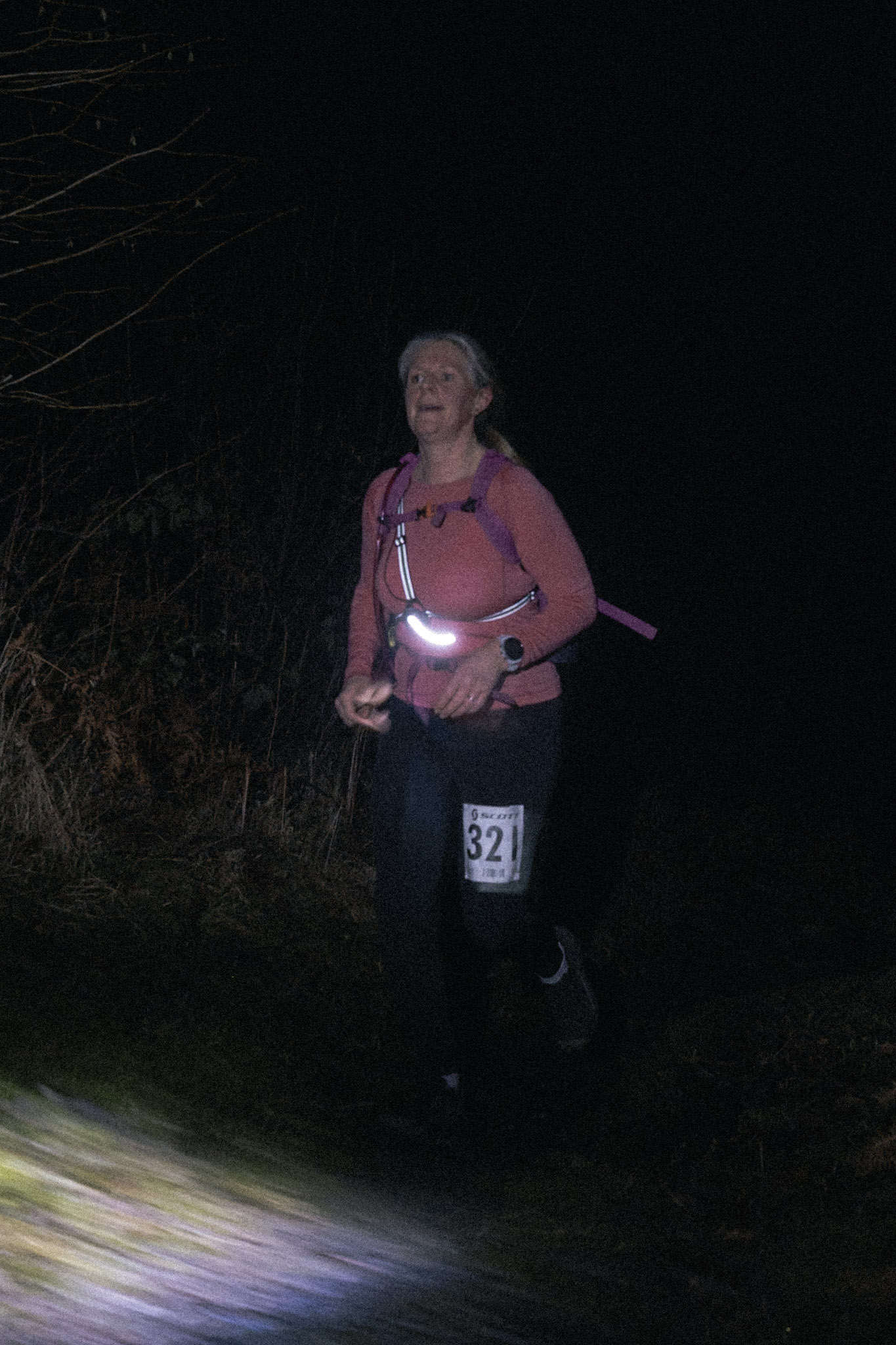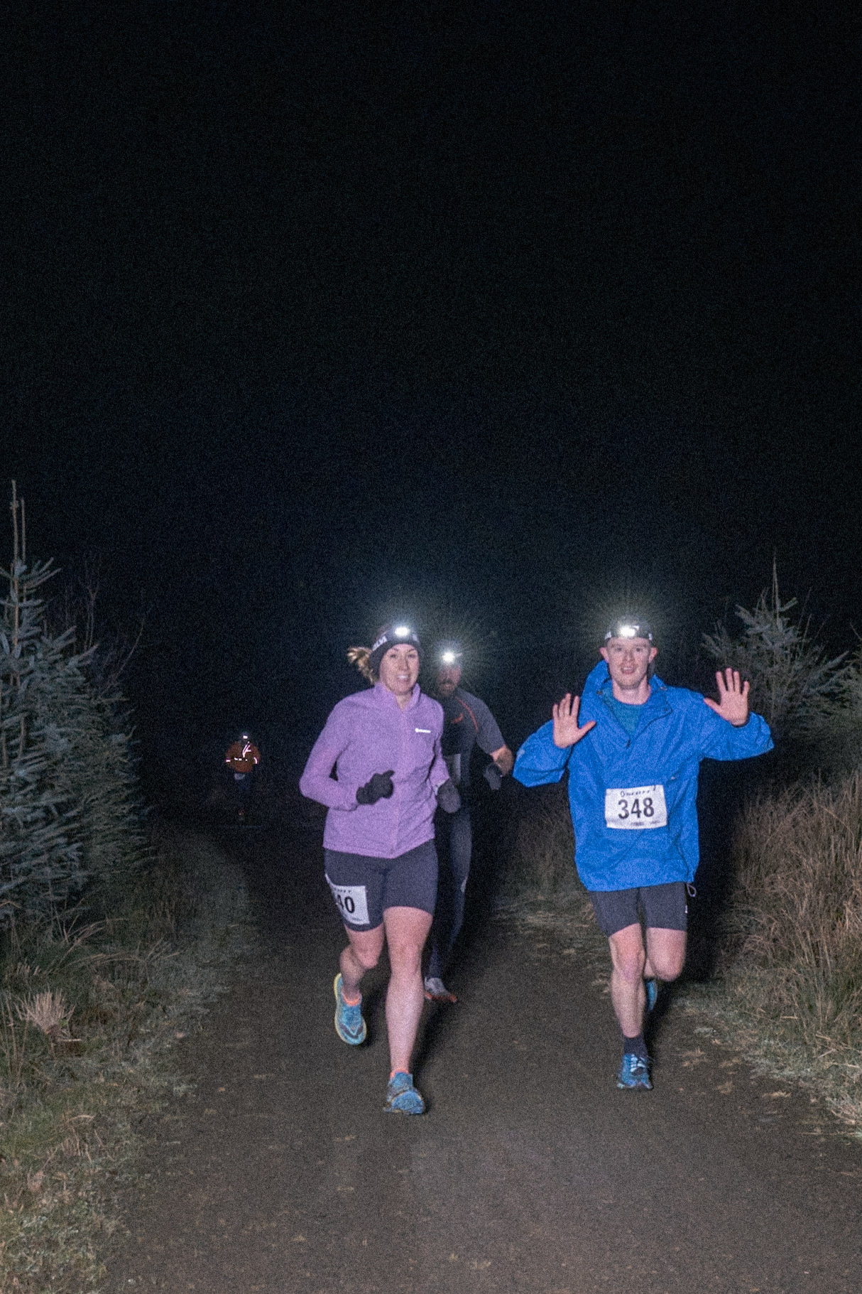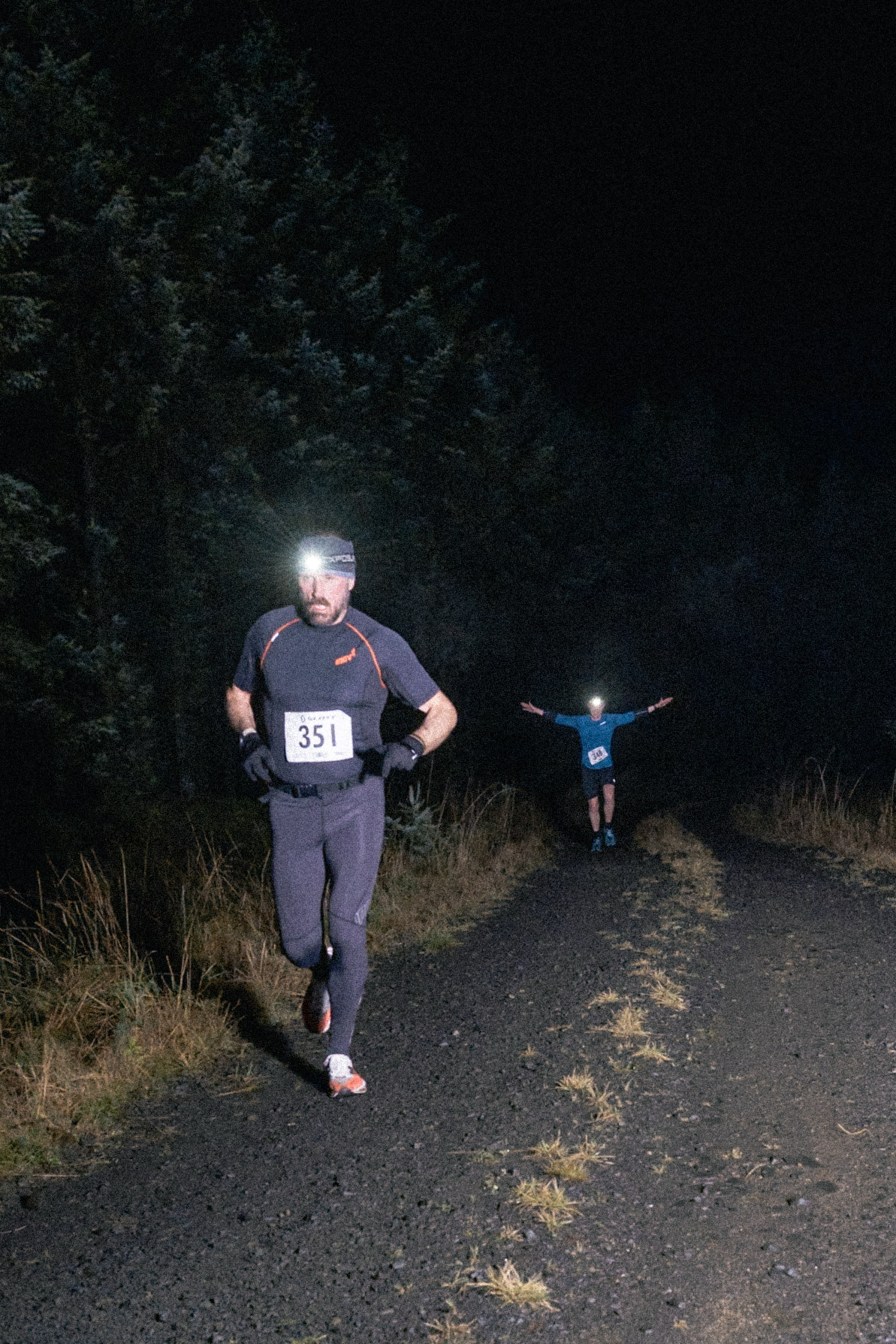 Turning off this main track everyone was thrust on to the toughest climb of the day which go gradually steeper until eventually everyone got to see myself and Ben waiting for you at the highest point. The front runners were through and away in a flash. The middle lot gave a friendly hi and the tail end were so knackered they had plenty to say! This high point offered a lovely vantage over the mountain bike descent and I watched headtorches meander down the hillside until they gently butted up against the forest track below. This freshly laid trail must have been a dream to run on with it’s wide aspect and large leaning berms.
