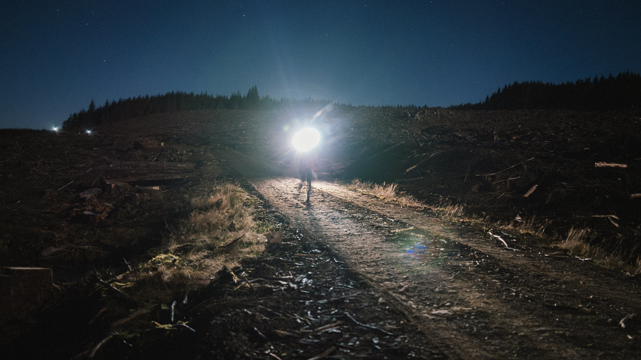 Joe offered out water at around two thirds race point but as usual most people were focussed and pressed on. The view of runners working their way down to the Lakeside way was magical. Headtorch lights flickered between trees, facing one way and then rounding a berm and facing the other. There was a little kicker after Fam’s bridge but after that it was all gravy down to Maddie and Weston waiting on the Lakeside Way. The leaders shot through and set off on the four mile stretch of Lakeside Way back to Kielder which for most mortals is a bit of a slog. Later runners could relax a bit more and might have had a chance to look up at the constellations that were screaming for attention above their heads.